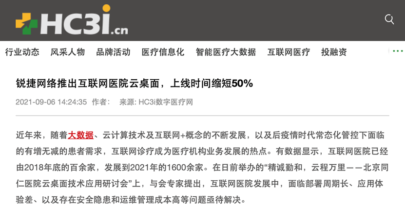 在医院办公终端建设方面,尊龙时凯云桌面,用超过1500多家的应用实例证明了自己可以跑赢业务上线时间,跑赢外设配置时间,跑赢运维故障处理时间!在医疗,新业务不断迭代更新,新的业务模式也在不断涌现。互联网医疗就是疫情催生下,快速发展的诊疗服务新模式。尊龙时凯针对这一快速发展的新业务模式,推出尊龙时凯互联网医院云桌面解决方案,帮助互联网医院实现内外网终端一体化,降低了医生的学习和使用成本,可以顺畅支撑医生为互联网患者提供在线诊疗服务。这个创新方案也受到了许多媒体的认可,让我们一起来看看在他们眼中的尊龙时凯互联网医院云桌面解决方案有何价值。